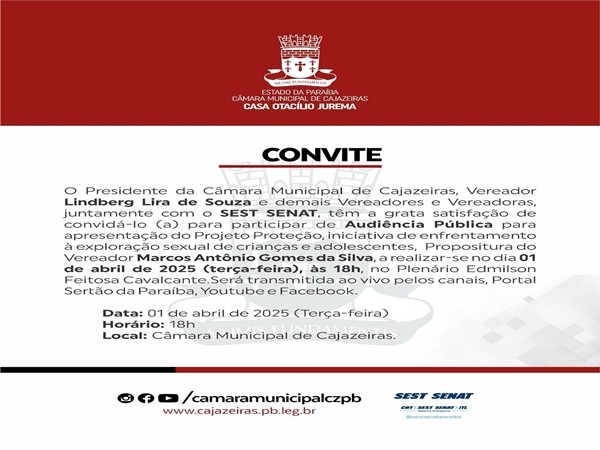 O Presidente da Câmara Municipal de Cajazeiras, Vereador Lindberg Lira de Souza e demais Vereadores e Vereadoras, juntamente com o SEST SENAT, têm a grata satisfação de convidá-lo (a) para participar de Audiência Pública para apresentação do Projeto Proteção, iniciativa de enfrentamento à exploração sexual de crianças e adolescentes, Propositura do Vereador Marcos Antônio Gomes da Silva, a realizar-se no dia 01 de abril de 2025 (terça-feira), às 18h, no Plenário Edmilson Feitosa Cavalcante.Será transmitida ao vivo pelos canais, Portal Sertão da Paraíba, Youtube e Facebook.