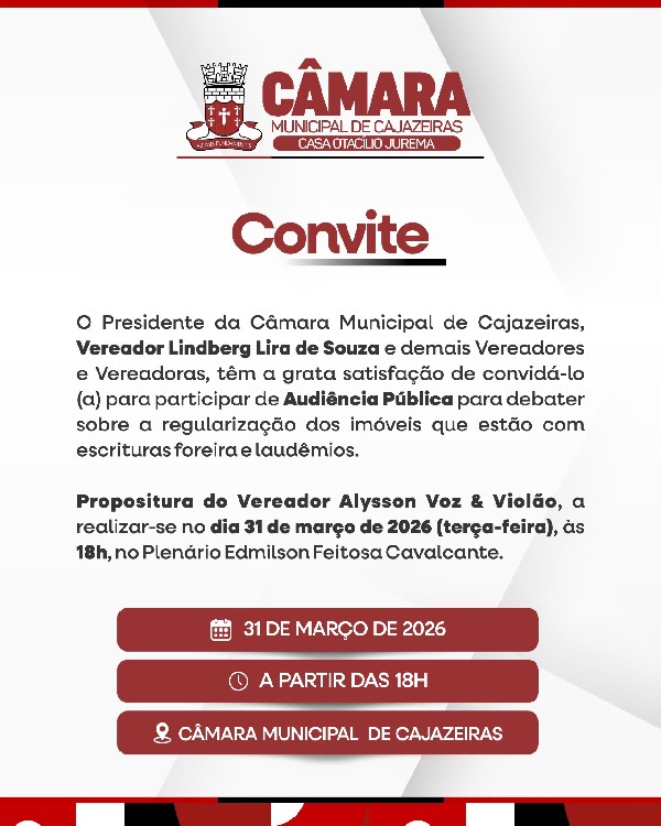 O Presidente da Câmara Municipal de Cajazeiras, Vereador Lindberg Lira de Souza e demais Vereadores e Vereadoras, têm a grata satisfação de convidá-lo(a) para participar de AUDIÊNCIA PÚBLICA para debater sobre a regularização dos imóveis que estão com escrituras foreira e laudêmios . Propositura do Vereador Alysson voz & violão, a realizar-se no dia 31 de março de 2026 (terça - feira), ás 18h,no Plenário Edmilson Feitosa Cavalcante.