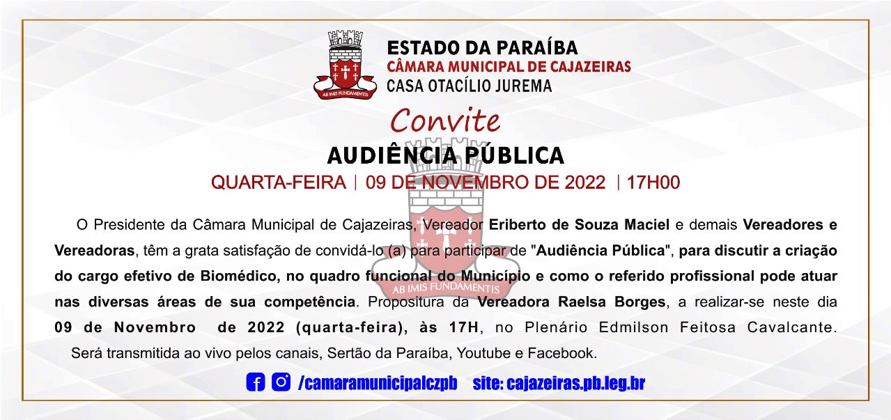 09 de novembro de 2022 aconteceu Audiência Pública para discutir a criação do cargo efetivo de Biomédico no quadro funcional do Município e como o referido profissional pode atuar nas diversas áreas de sua competência.