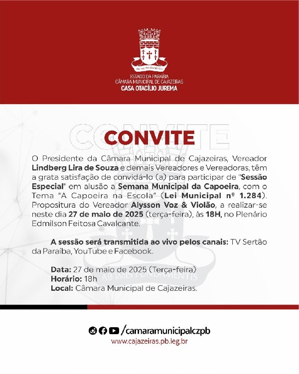 O Presidente da Câmara de Cajazeiras, Lindberg Lira de Souza e demais vereadores e vereadoras, tem a grata satisfação de convida-lo (a) a participar da Sessão Especial em alusão a Semana Municipal da Capoeira. Propositura do Vereador Alysson Voz e Violão, a realizar-se neste dia 27 de Maio de 2025 (terça-feira), às 18H no Plenário Edmilson Feitosa Cavalcante.