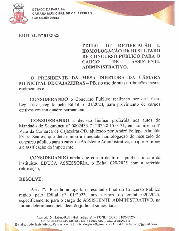 EDITAL DE RETIFICAÇÃO E HOMOLOGAÇÃO DE RESULTADO DE CONCURSO PÚBLICO