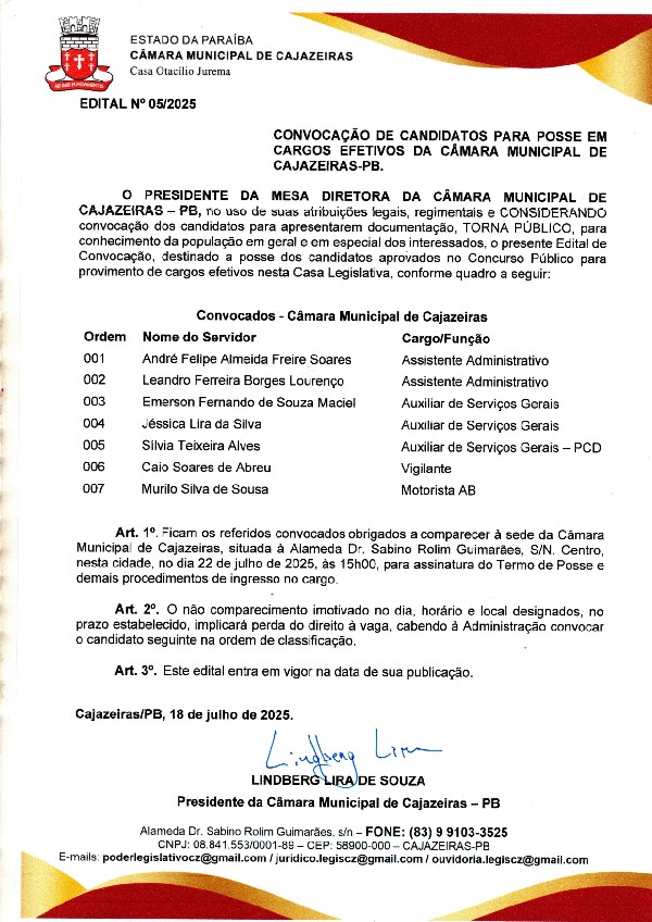 CONVOCAÇÃO DE CANDIDATOS PARA POSSE EM CARGOS EFETIVOS DA CÂMARA MUNICIPAL DE CAJAZEIRAS - PB