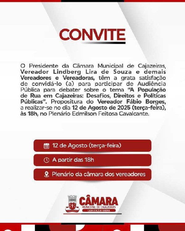 A Câmara Municipal de Cajazeiras realiza, no próximo dia 12 de agosto de 2025 (terça-feira), às 18h, uma audiência pública de grande relevância social.