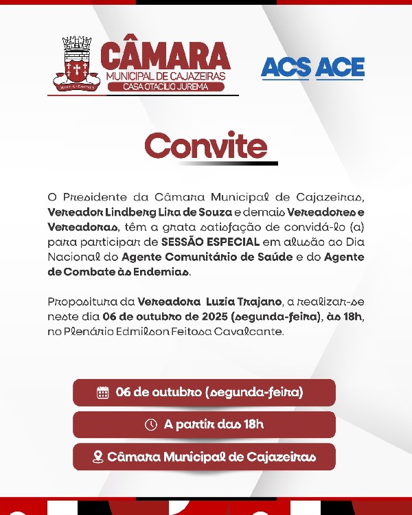 O Presidente da Câmara Municipal de Cajazeiras, Vereador Lindberg Lira de Sousa e demais Vereadores e Vereadoras , têm a grata satisfação de convida-lo (a) para participar de SESSÃO ESPECIAL em alusão ao Dia Nacional do Agente Comunitário de Saúde e do Agente de Combate ás Endemias,ACS-ACE.