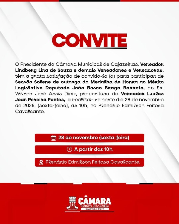 O Presidente da Câmara Municipal de Cajazeiras , Vereador Lindberg Lira de Souza e demais vereadores e vereadoras, têm a grata satisfação de convidá-lo (a) para participar de Sessão solene de outorga da Medalha de Honra ao Mérito Legislativo Deputado João Bosco Braga Barreto, ao Sr. Wilson José Assis Diniz.